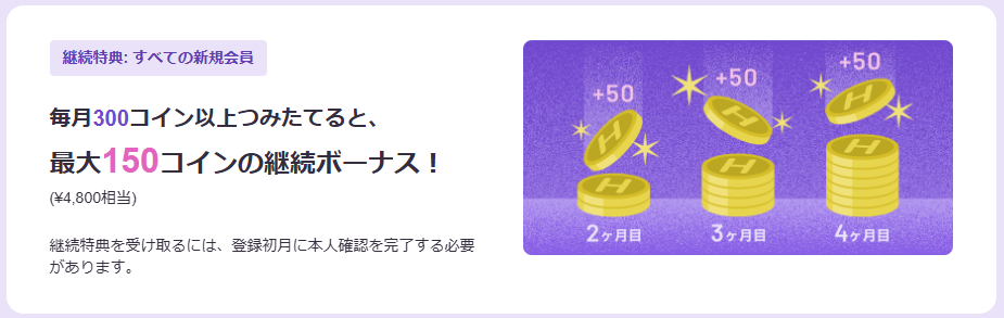 300コイン以上のつみたてを2~4ヶ月目までの3ヶ月間続けると、継続ボーナスで毎月50コイン=最大合計150コインがもらえる!