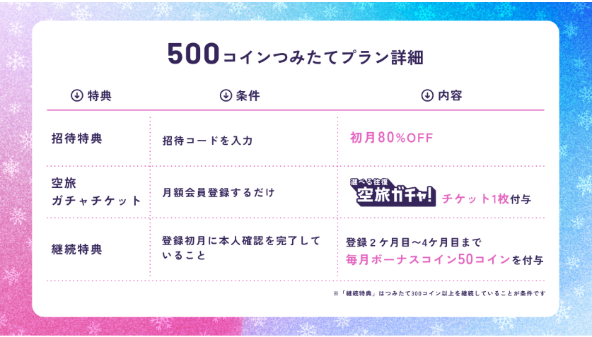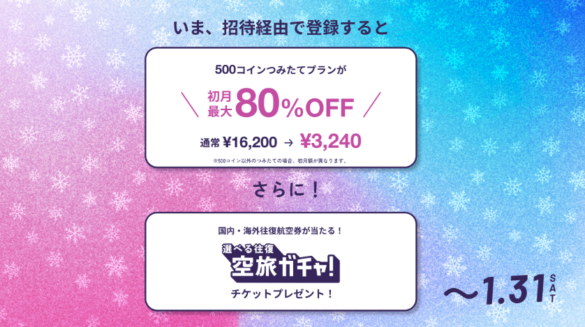 招待経由で登録すると「500コインつみたてプラン」が初月のみ80%OFFの3,240円になるよ✨