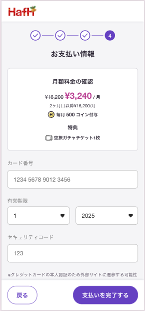 クレジットカード情報を入力したら、月額会員登録は完了!