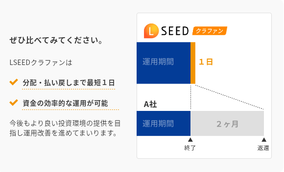 LSEEDではファンドの運用終了後、最短1日で分配・払い戻し(=投資したお金と利益の支払い)をしてくれるから、資金回収がスピーディー!
