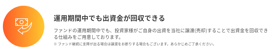 ファンドに投資した分=出資を、運営会社に譲渡(売却)することで回収できるしくみだよ。